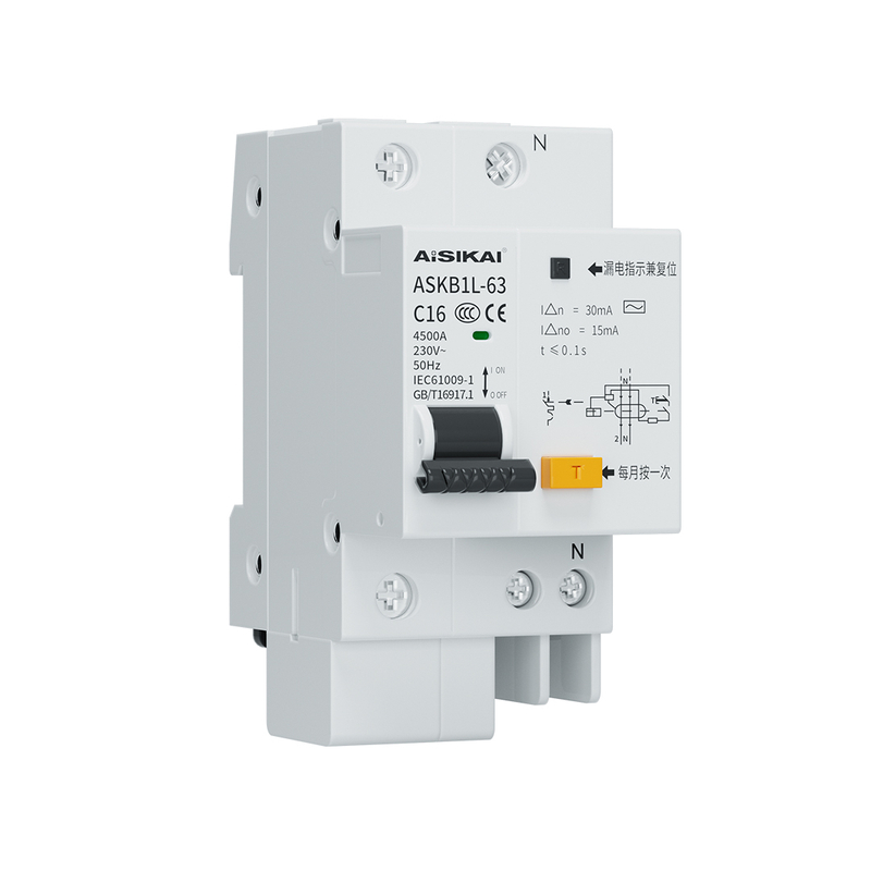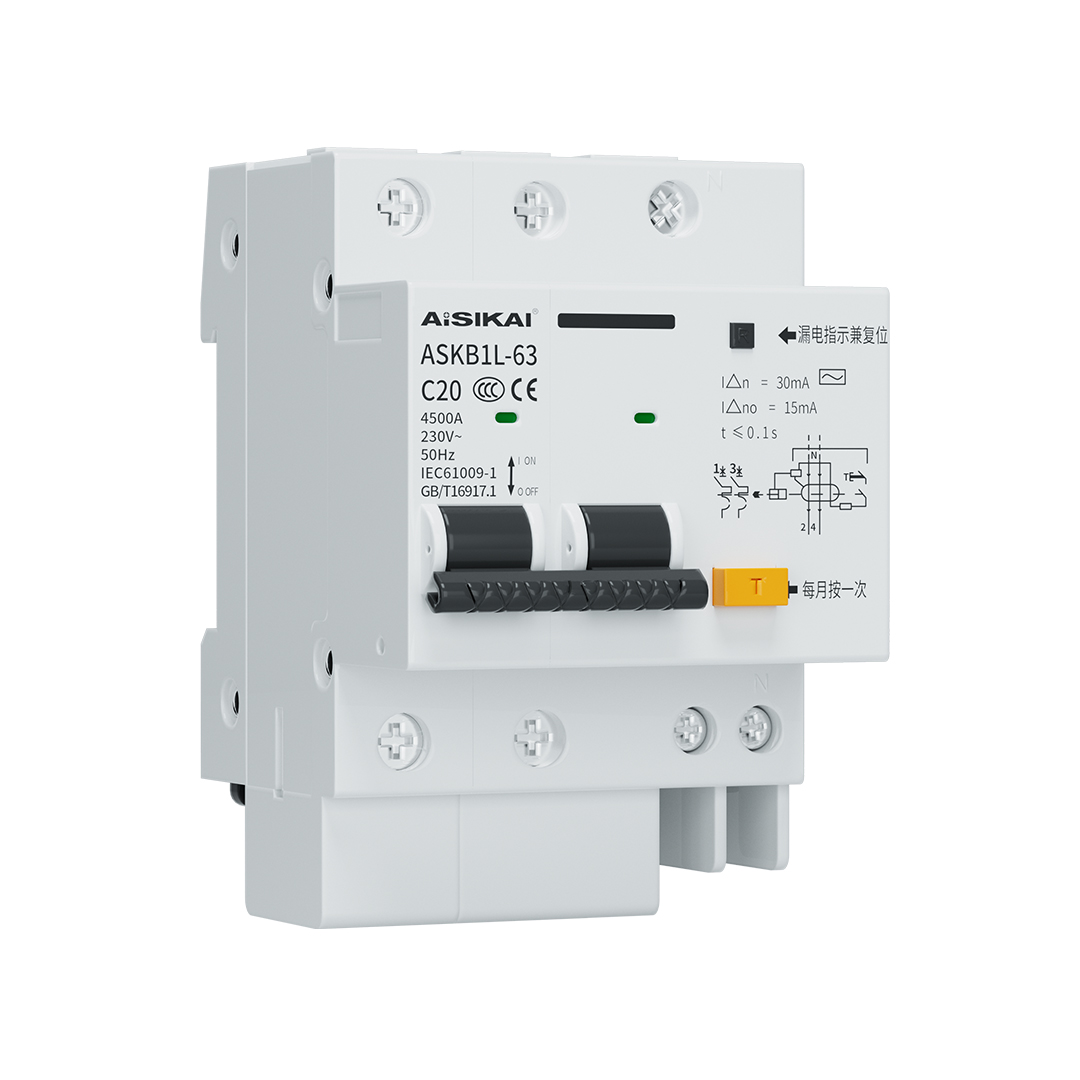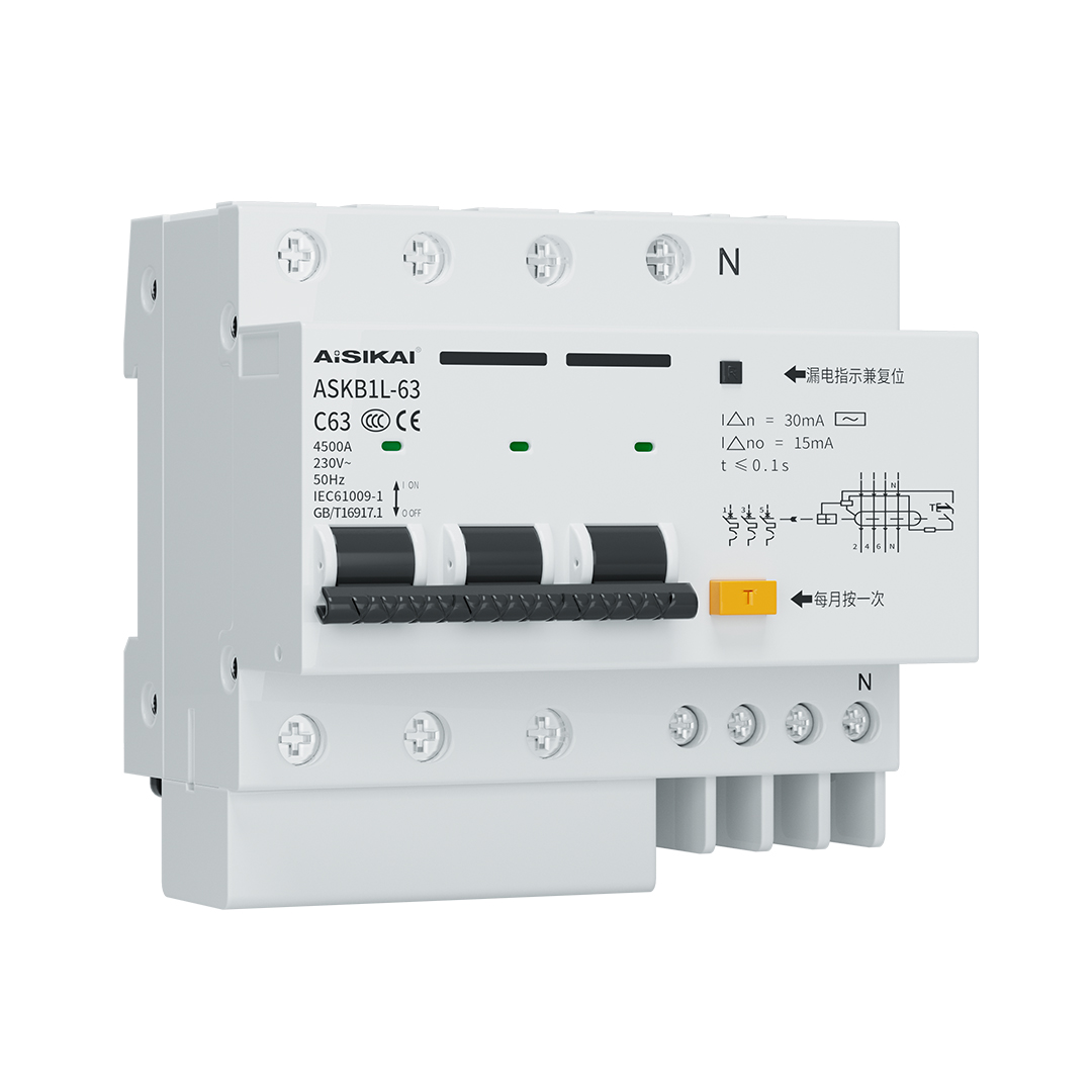 A1: The ASKB1L integrates short-circuit protection, overload protection, leakage protection, isolation, and control functions. Its leakage protection detects residual current in the circuit (e.g., default 30mA or 50mA). When the vector sum of currents is not zero, the electronic tripper triggers a trip to disconnect the circuit, safeguarding distribution lines and personnel. It is suitable for AC 50Hz systems with rated voltages of 230V/400V, currents up to 125A, and is designed for lighting and power distribution applications.