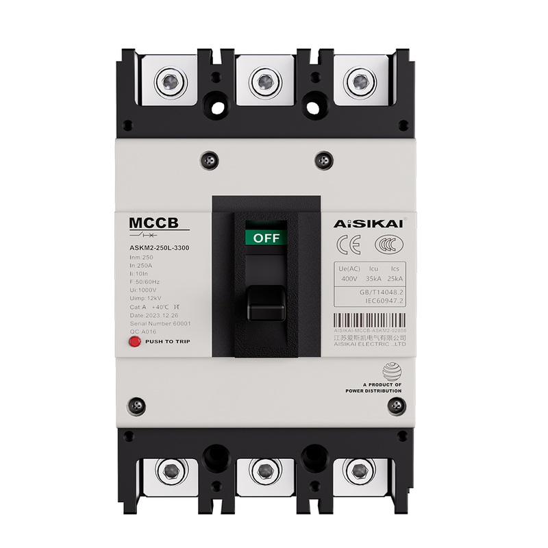 Breaking capacity refers to the maximum short-circuit current an MCCB can safely interrupt, measured in kA. For the ASKM2, this ranges from 15kA to 75kA (depending on the model). Selecting a breaker with a breaking capacity equal to or greater than the potential fault current in the system is critical to prevent damage during short-circuit events.