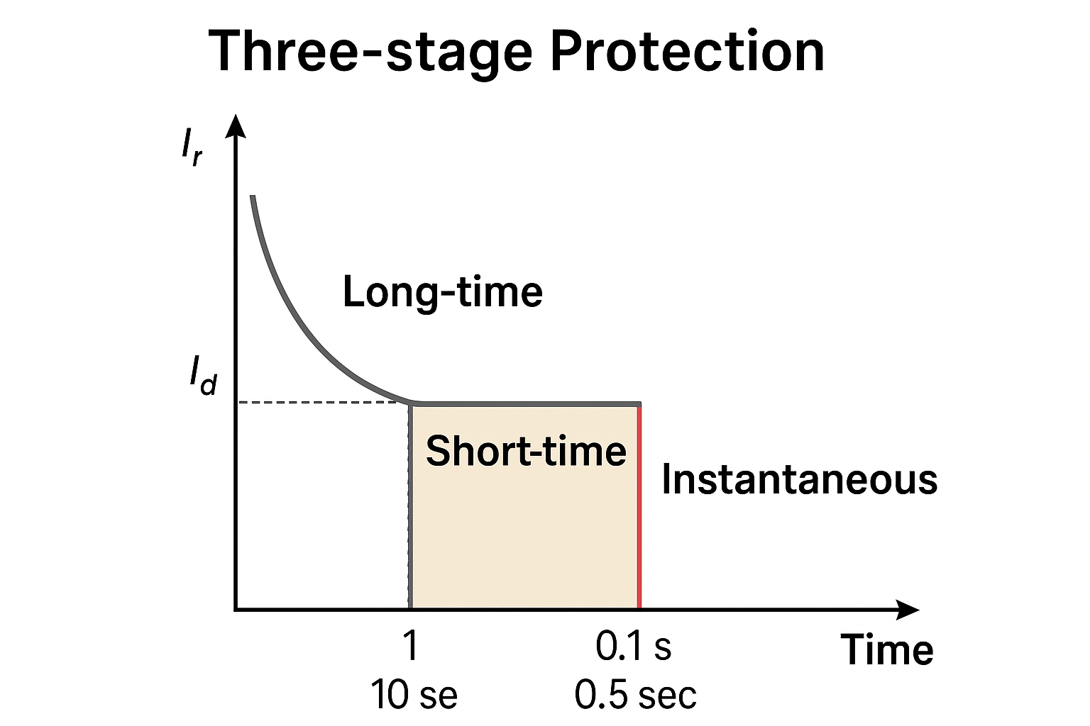 Three-stage protection is a common overcurrent protection strategy used in modern low-voltage circuit breakers (MCCBs, ACBs). Its core idea is to divide overcurrent faults into three levels, each handled according to its current magnitude and time delay, ensuring safe fault clearing while maintaining selectivity.